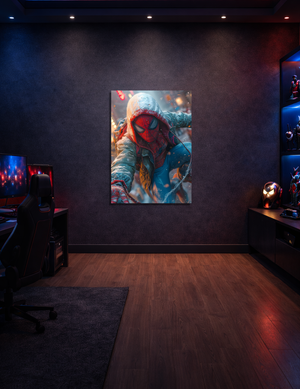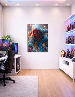 ❄️ Spider-Man’in kış atmosferinde, kapüşonlu kostümüyle şehirde aksiyon aldığı bu sinematik metal tablo, sahnenin soğuk havasını ve kahraman enerjisini duvarlara taşır.