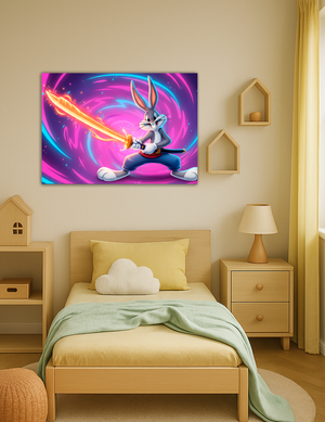 Bu özel metal tablo, Bugs Bunny’nin enerji dolu neon bir girdap içinde ışık kılıcıyla verdiği epik pozu modern bir anime stiliyle birleştiriyor. Parlayan kılıç detayları, canlı renk geçişleri ve dinamik sahne sayesinde odanıza güçlü, enerjik ve dikkat çekici bir hava katar.