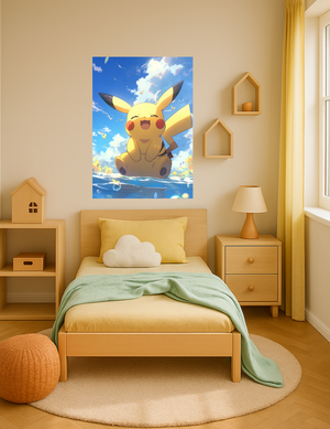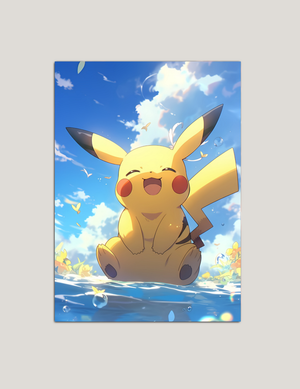 Bu özel metal tablo, Pikachu’nun güneşli bir yaz gününde kahkaha attığı bu sıcak ve huzurlu sahneyi modern anime estetiğiyle bir araya getiriyor. Parlak mavi gökyüzü, ışık yansımaları, su damlaları ve uçuşan kelebekler ile odanıza mutluluk dolu bir atmosfer katar.