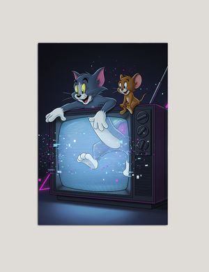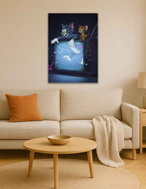 Bu özel tasarım metal tablo, Tom & Jerry’nin ikonik enerjisini retro bir televizyonun içinden dışarı taşırarak modern neon tonlarıyla buluşturuyor. Glitch detayları ve dinamik sahne, odaya hem nostaljik hem de canlı bir atmosfer katar.