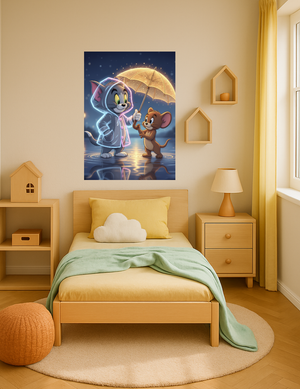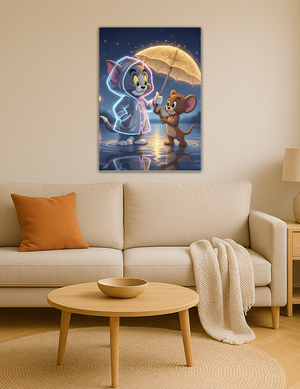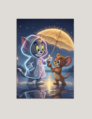 🎨 Tom & Jerry – Yağmur Altında Işıltılı Dostluk Metal Tablo