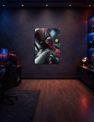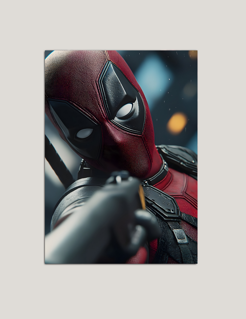 😈 Deadpool’un ikonik maskesini ve alaycı bakışını ön plana çıkaran bu yakın plan sahne, karakterin karanlık mizahını ve asi ruhunu duvarlara taşır.